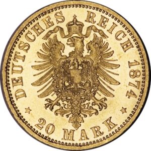 La pièce de 20 mark allemands est une pièce d’or historique avec une pureté de 90 % (21,6 carats). Elle pèse 7,96 grammes brut et contient 7,16 grammes d’or pur.
